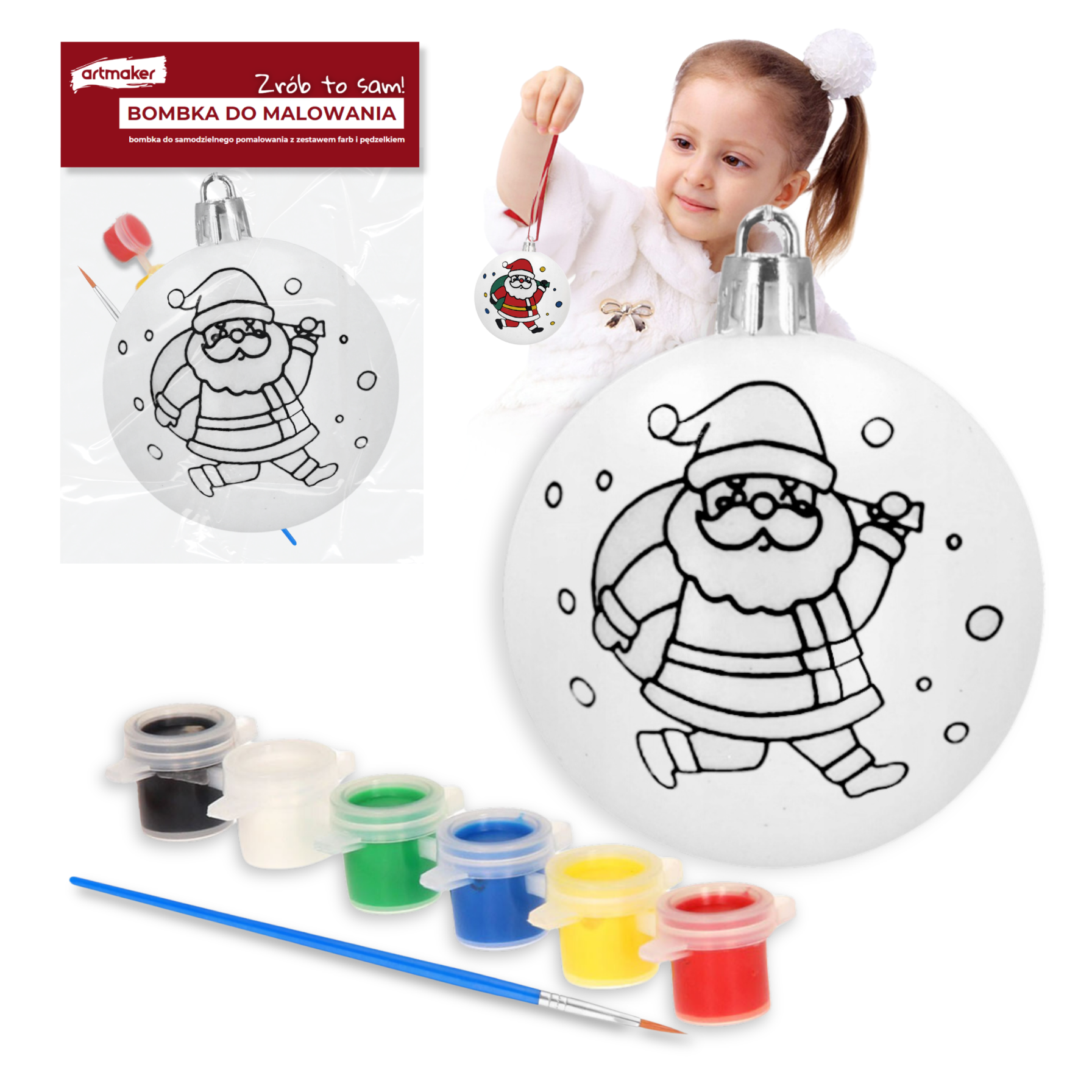 Ten wyjątkowy zestaw bombki do malowania to doskonały pomysł na świąteczny prezent dla dzieci i dorosłych, którzy chcą wprowadzić osobisty akcent do swoich dekoracji. Zestaw zawiera 1 plastikową bombkę z nadrukiem Mikołaja. Do zestawu dołączone są również 6 farb akrylowych oraz pędzelek, dzięki czemu bombkę można łatwo zawiesić na choince po pomalowaniu.