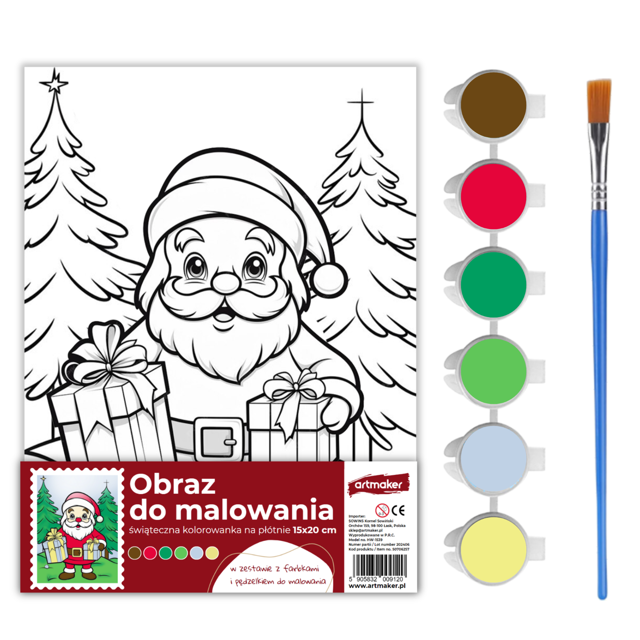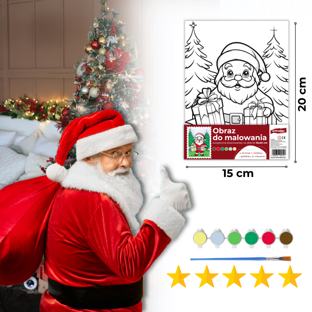 Płótno malarskie z nadrukiem świątecznym przedstawiającym Mikołaja to doskonały pomysł na prezent, który zachwyci zarówno dzieci, jak i dorosłych. Zestaw zawiera 6 farb akrylowych oraz pędzelek, dzięki czemu jest gotowy do malowania. Wymiary płótna 15x20 cm oraz grubość 1,5 cm sprawiają, że jest to idealny rozmiar na twórczą zabawę i stworzenie wyjątkowej dekoracji świątecznej.