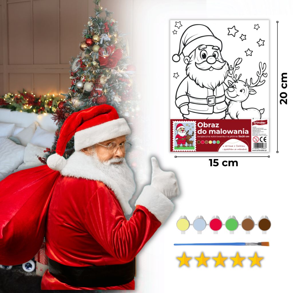 Płótno malarskie z nadrukiem świątecznym przedstawiającym Mikołaja to doskonały pomysł na prezent, który zachwyci zarówno dzieci, jak i dorosłych. Zestaw zawiera 6 farb akrylowych oraz pędzelek, dzięki czemu jest gotowy do malowania. Wymiary płótna 15x20 cm oraz grubość 1,5 cm sprawiają, że jest to idealny rozmiar na twórczą zabawę i stworzenie wyjątkowej dekoracji świątecznej.