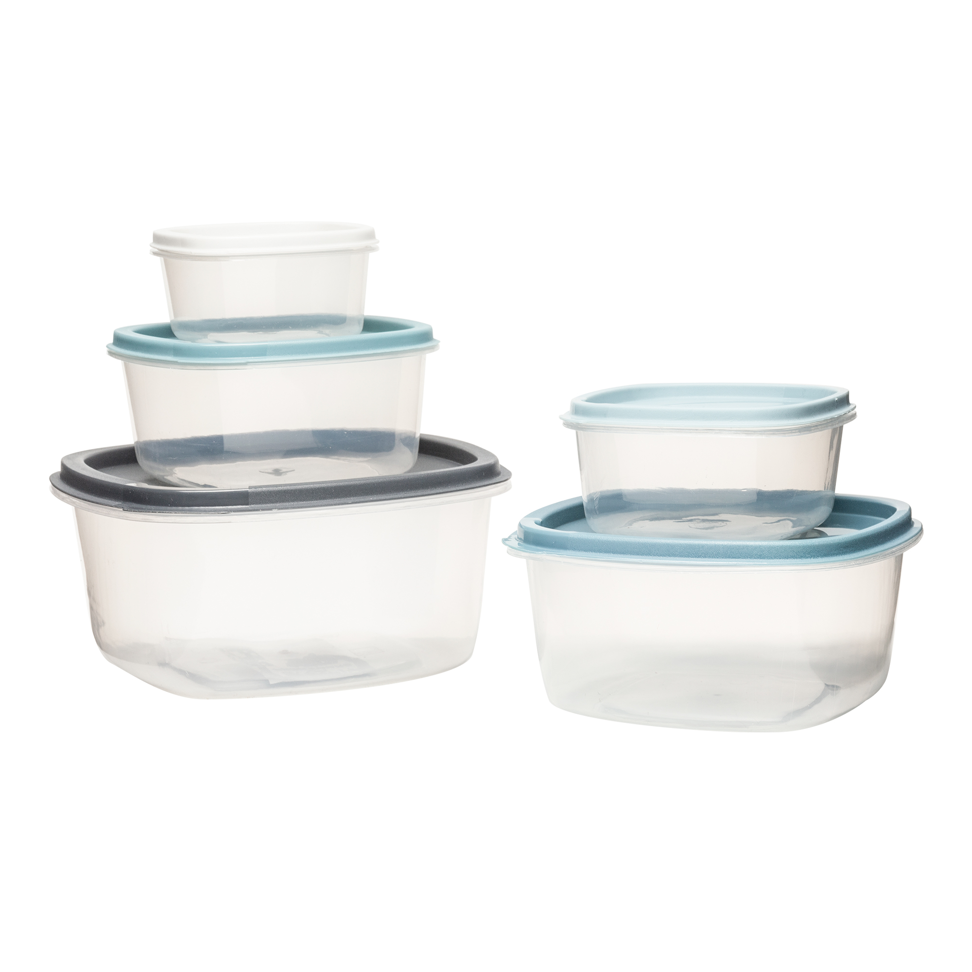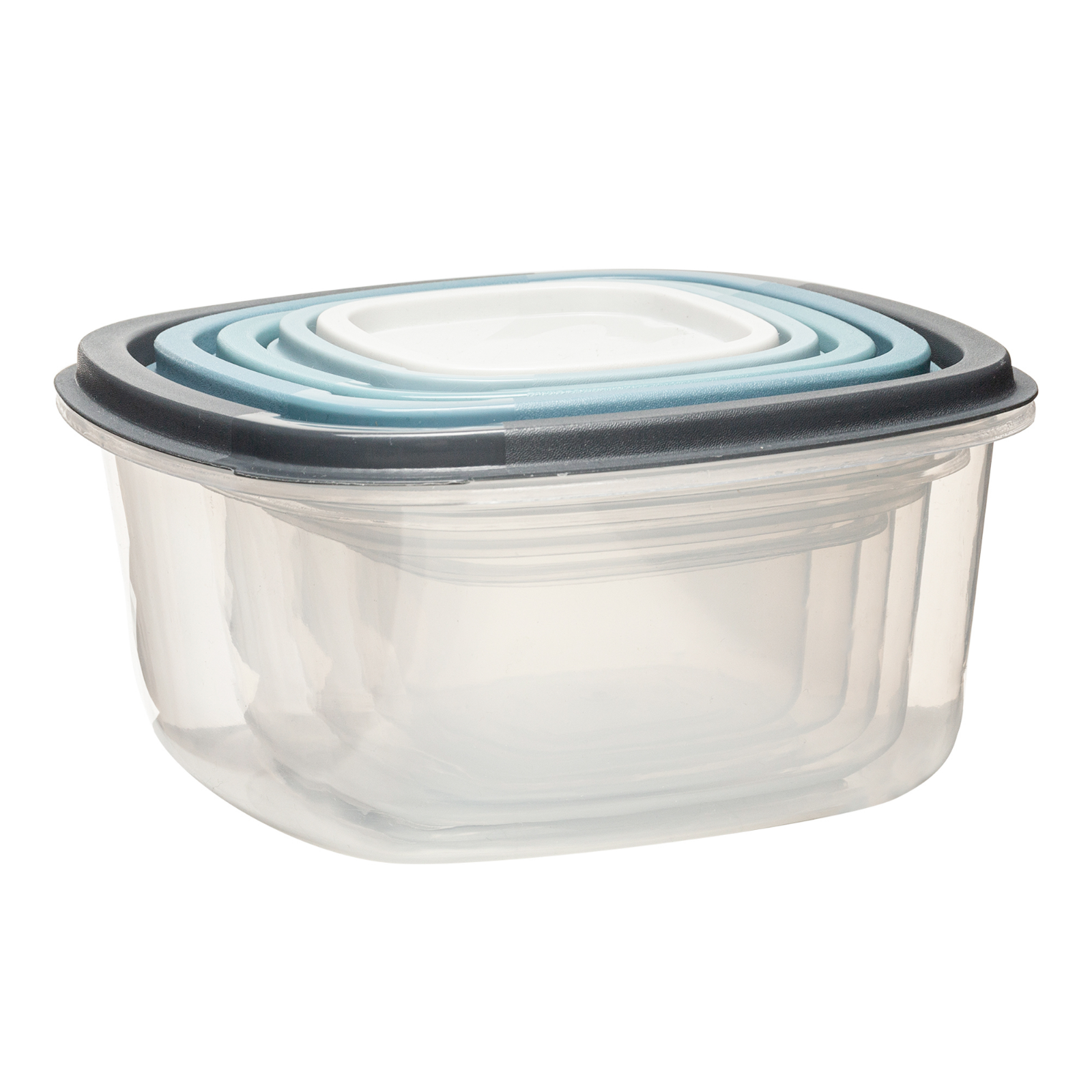 - Kolor: Pojemniki transparentne, pokrywki w odcieniach niebieskiego i szarości