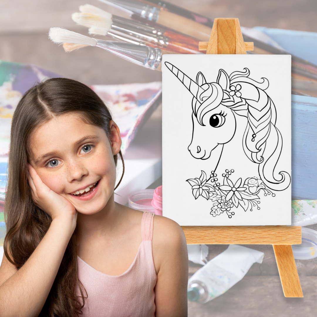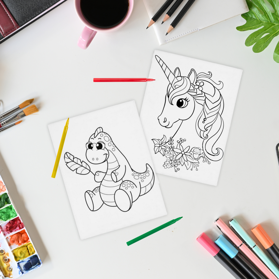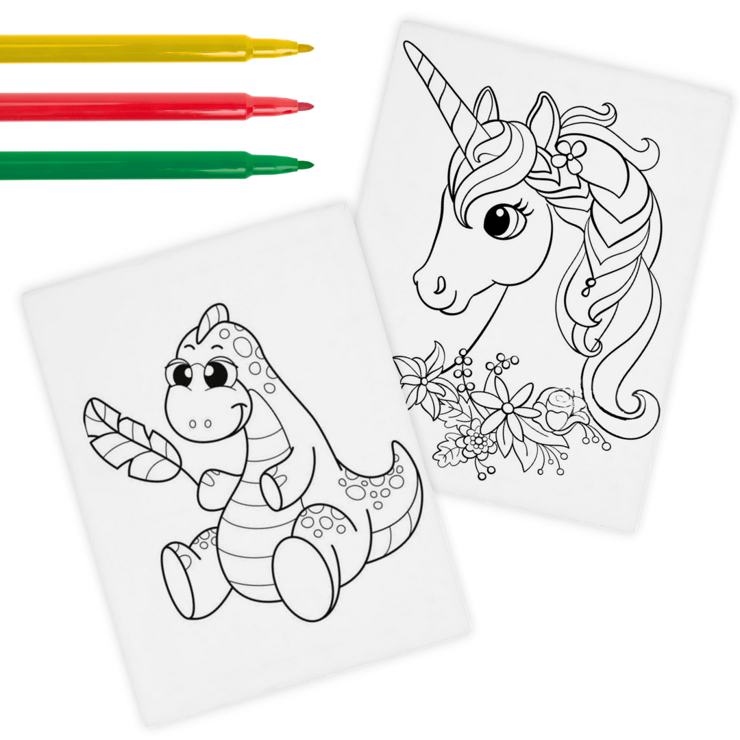 Zaprezentuj swoje umiejętności malarskie z naszymi obrazkami do kolorowania, które przedstawiają dinozaura i jednorożca. Zestaw zawiera 2 panele malarskie o wymiarach 10x15 cm oraz zestaw trzech mazakom do kolorowania w kolorze zielonym, zółtym i czerwonym.