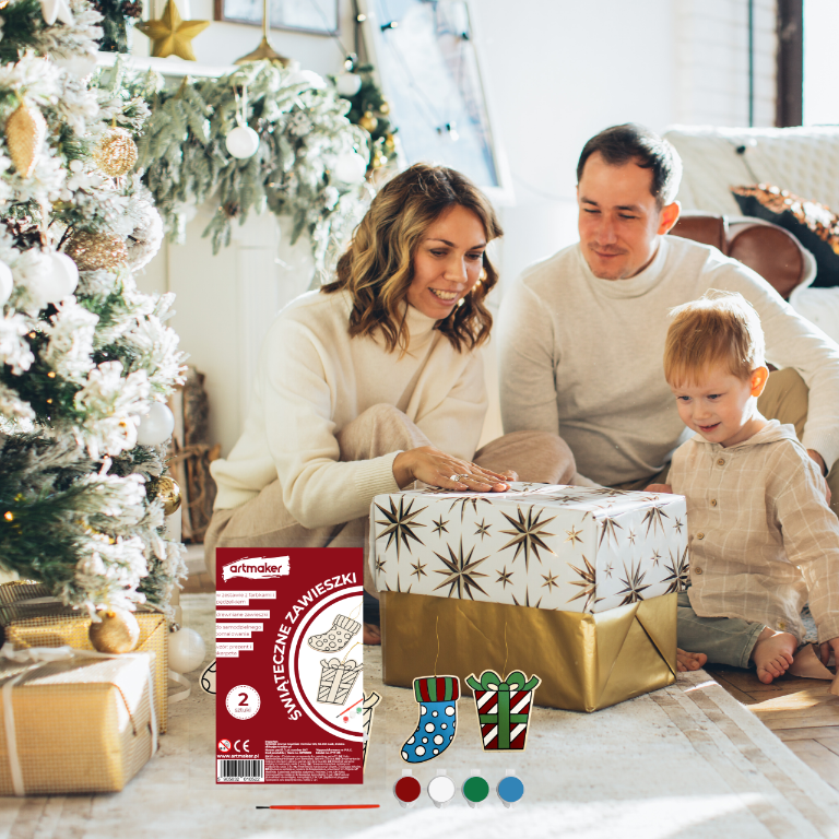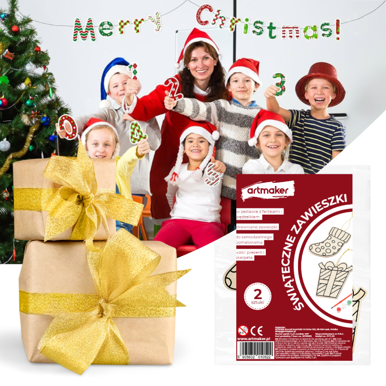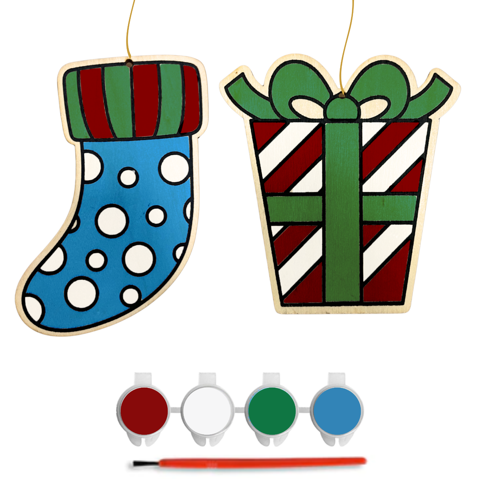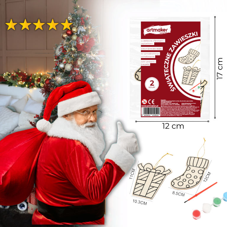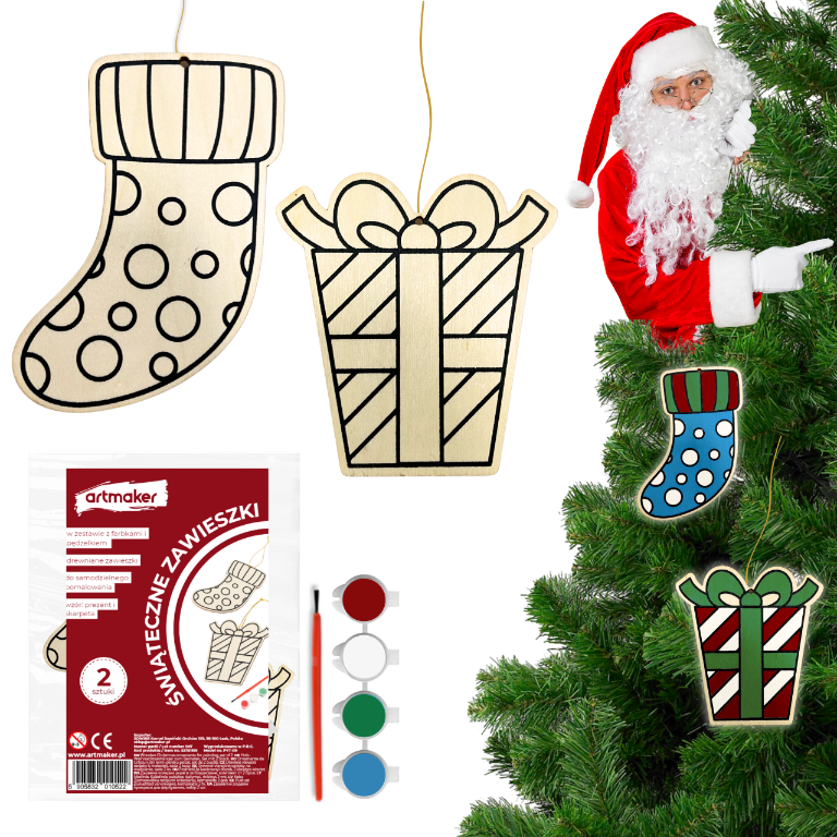 Drewniane zawieszki świąteczne w zestawie z farbkami i pędzlem wzór prezent/skarpeta Artmaker