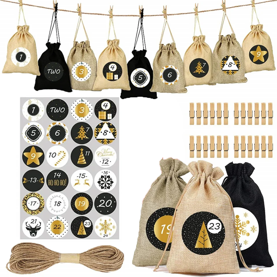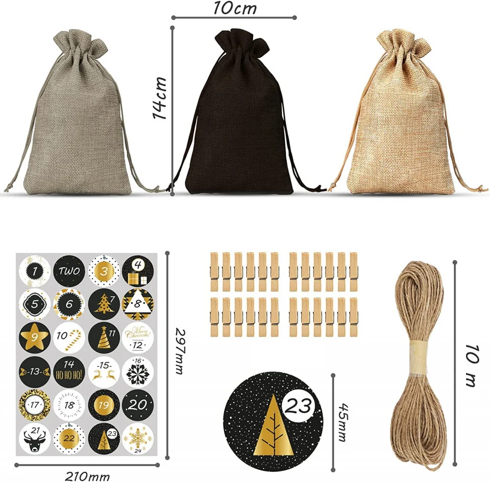 Wprowadź wyjątkową atmosferę do swojego domu podczas adwentu z naszym oryginalnym i ekologicznym kalendarzem adwentowym! Prezentujemy zestaw 24 jutowych woreczków w przepięknych, ciepłych odcieniach – czarnym, naturalnym oraz jasnobeżowym. Każdy woreczek o wymiarach 10x14 cm, jest idealnym miejscem na ukrycie małych niespodzianek i słodkości dla najbliższych. Do zestawu dołączono również 24 starannie zaprojektowane naklejki, 10 metrów sznurka oraz 24 klamerki drewniane, które pozwolą na kreatywne i różnorodne wyeksponowanie kalendarza.