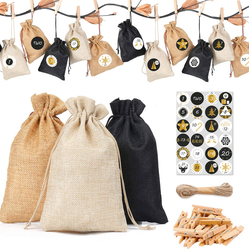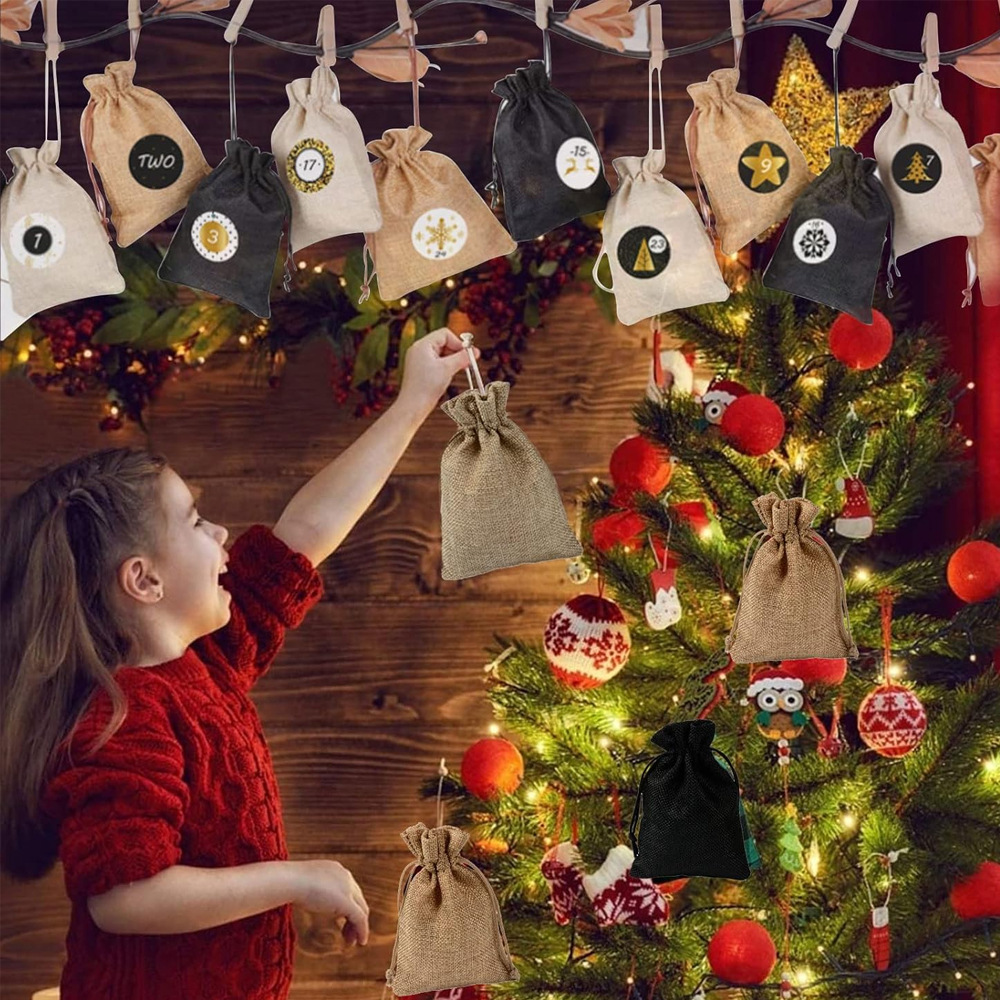 Kalendarz adwentowy DIY materiałowe torebki woreczki jutowe 24 szt. + sznurek + naklejki + klipsy kompletny zestaw Artmaker