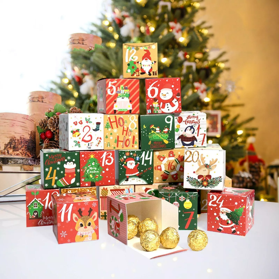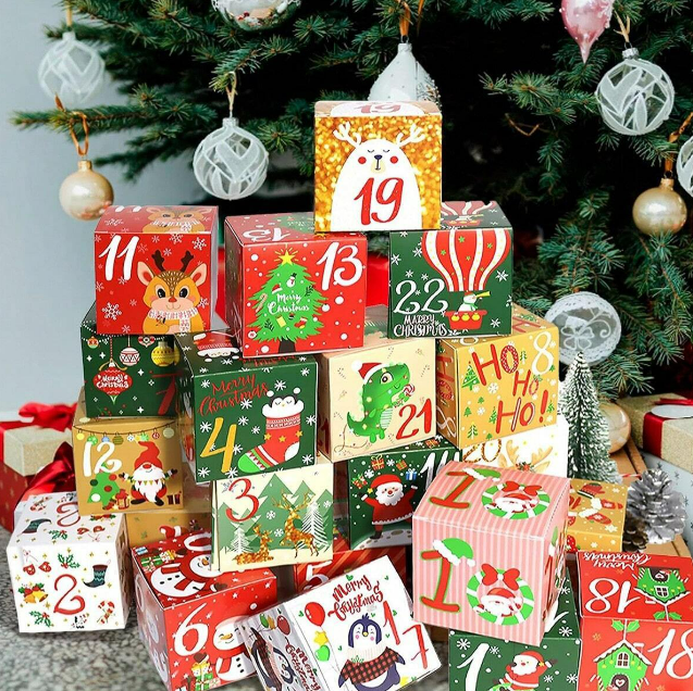 ✔️ Zestaw 24 kolorowych pudełek z nadrukiem – idealne do złożenia i wypełnienia własnoręcznie wybranymi upominkami, co pozwoli Ci stworzyć coś naprawdę unikalnego.