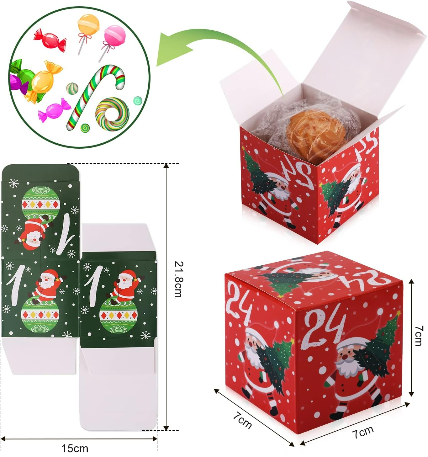 ⭐24 papierowe pudełeczka z świątecznym nadrukiem o wymiarach 7x7x7cm