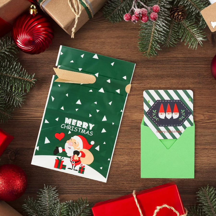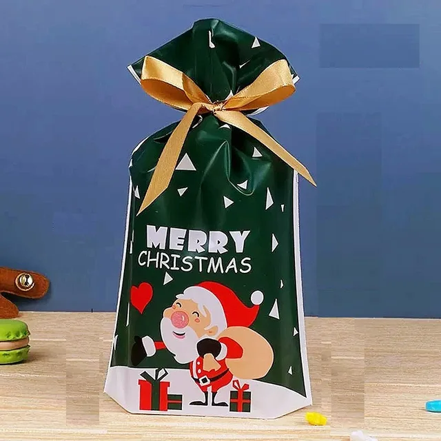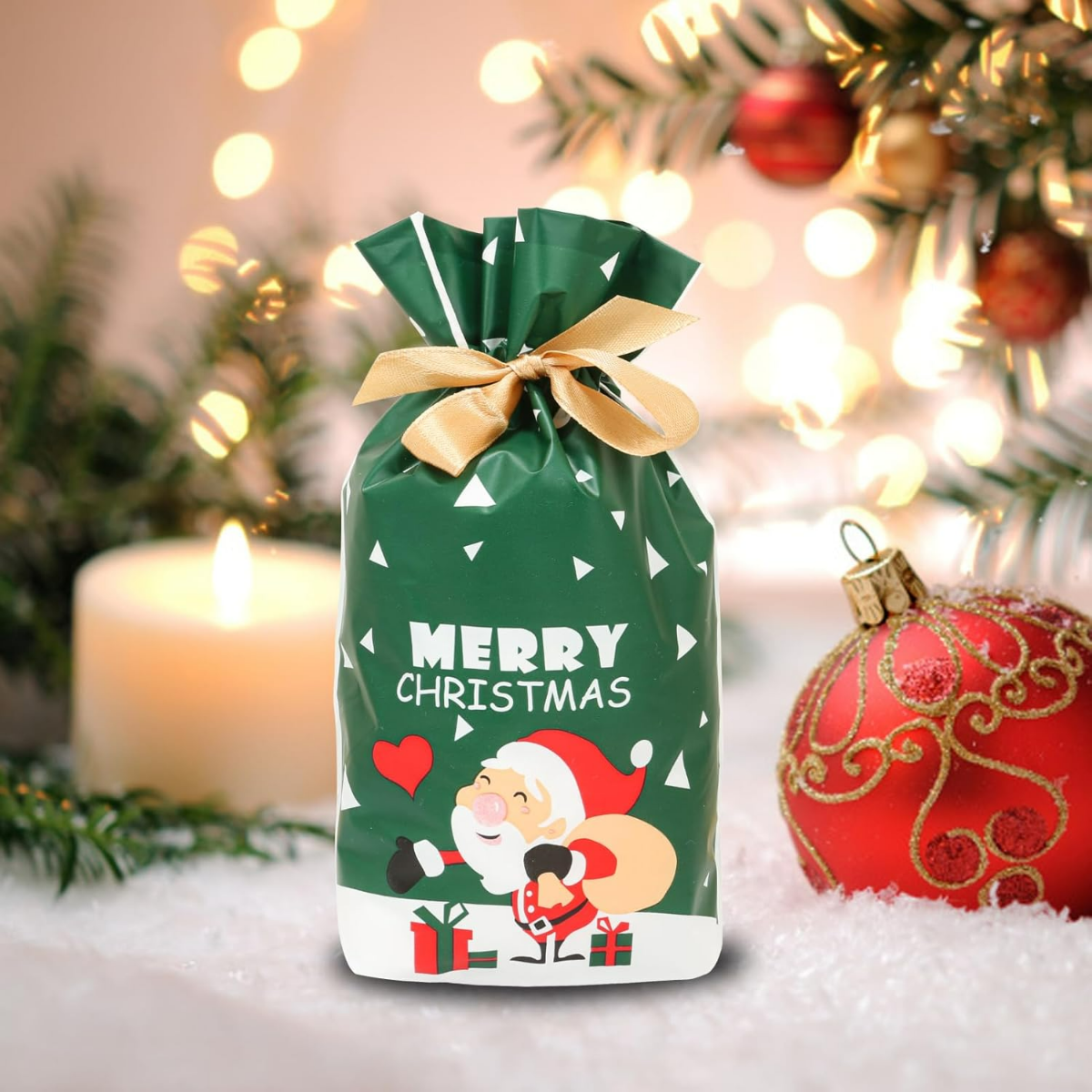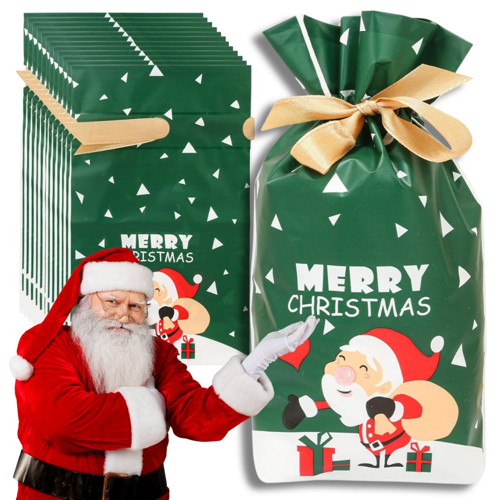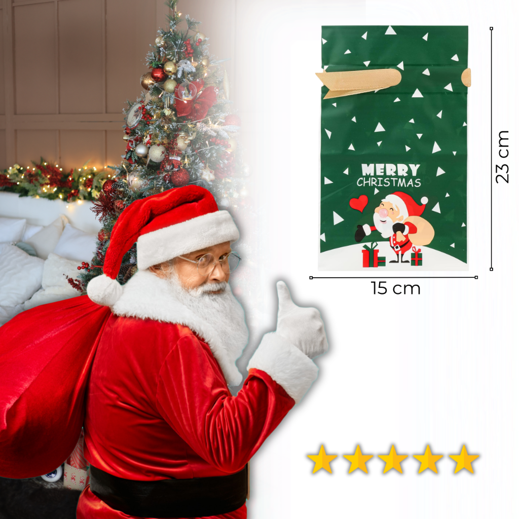 Nasze świąteczne torebki to szybki i efektowny sposób na pakowanie upominków. Klasyczny zielony kolor i nadruk Mikołaja z napisem "MERRY CHRISTMAS" sprawiają, że torebki doskonale wpisują się w świąteczną atmosferę. Dzięki dołączonej złotej wstążce zamykanie ich jest proste i eleganckie, a zestaw 50 sztuk zapewnia, że masz wystarczającą ilość na wszystkie prezenty.