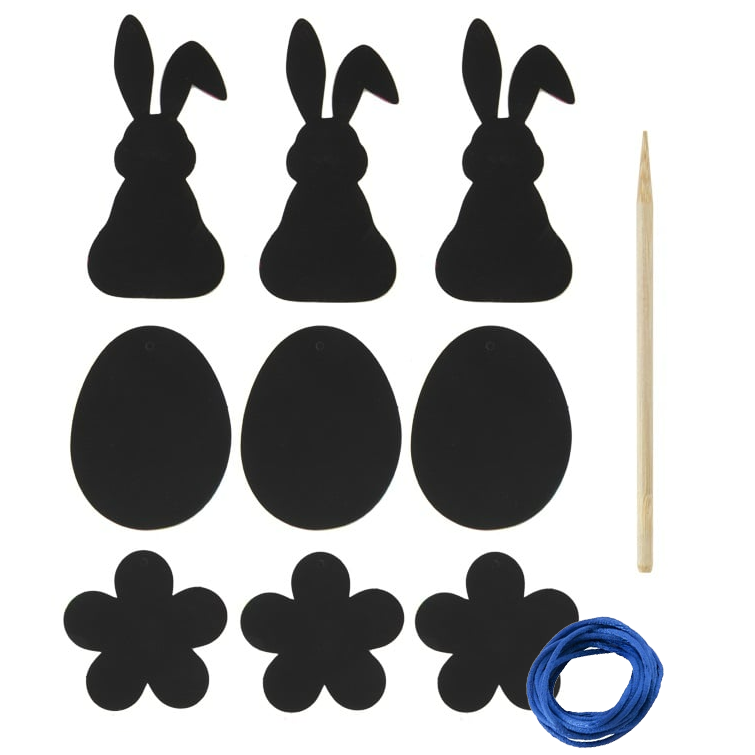 W komplecie znajdziesz 9 elementów: 3 jajeczka, 3 zajączki oraz 3 kwiatki, każdy z unikalnym, wielkanocnym nadrukiem na odwrocie. Dołączony patyczek pozwala na precyzyjne wydrapywanie wzorów, a 2 metry granatowego sznurka umożliwiają zawieszenie gotowych dekoracji. Każda wydrapywanka ma wysokość 8,5 cm, dzięki czemu idealnie nadaje się do zdobienia domu, szkoły czy przedszkola.