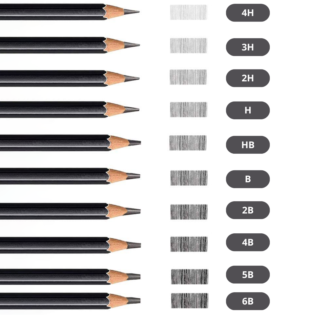 ✅ Różnorodne twardości: 6B, 5B, 4B, 2B, B, HB, H, 2H, 3H, 4H – pozwalają na wszechstronne zastosowanie w rysunku