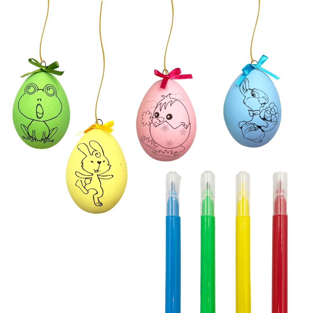 Jeśli szukasz pomysłu na kreatywną zabawę z dziećmi, to zestaw jajeczek do malowania będzie doskonałym rozwiązaniem. Ten uroczy zestaw składa się z 4 kolorowych jajeczek na sznurku z nadrukowanym wielkanocnym wzorem, oraz 4 mazaków w kolorze niebieskim, zielonym, żółtym i czerwonym.