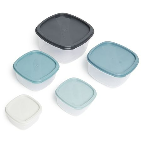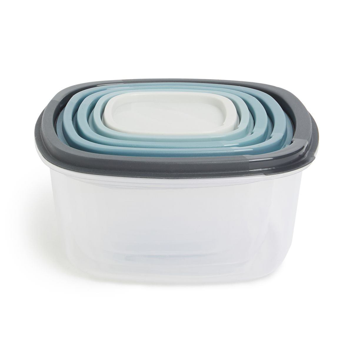 - Kolor: Pojemniki transparentne, pokrywki w odcieniach niebieskiego i szarości
