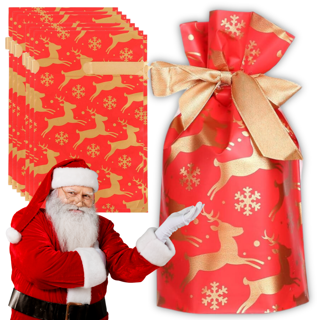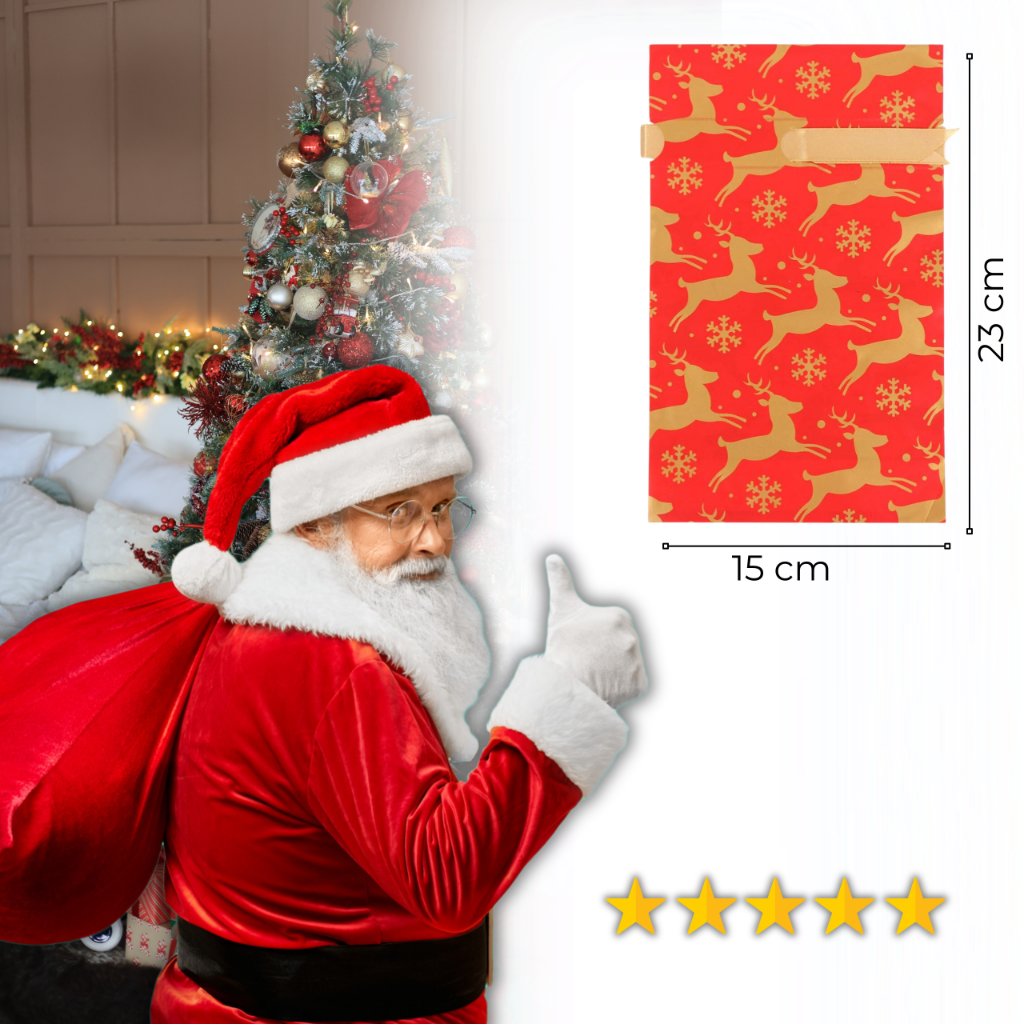 Nasze świąteczne torebki to szybki i efektowny sposób na pakowanie upominków. Klasyczny czerwony kolor i złoty nadruk reniferów sprawiają, że torebki doskonale wpisują się w świąteczną atmosferę. Dzięki dołączonej złotej wstążce zamykanie ich jest proste i eleganckie, a zestaw 50 sztuk zapewnia, że masz wystarczającą ilość na wszystkie prezenty.