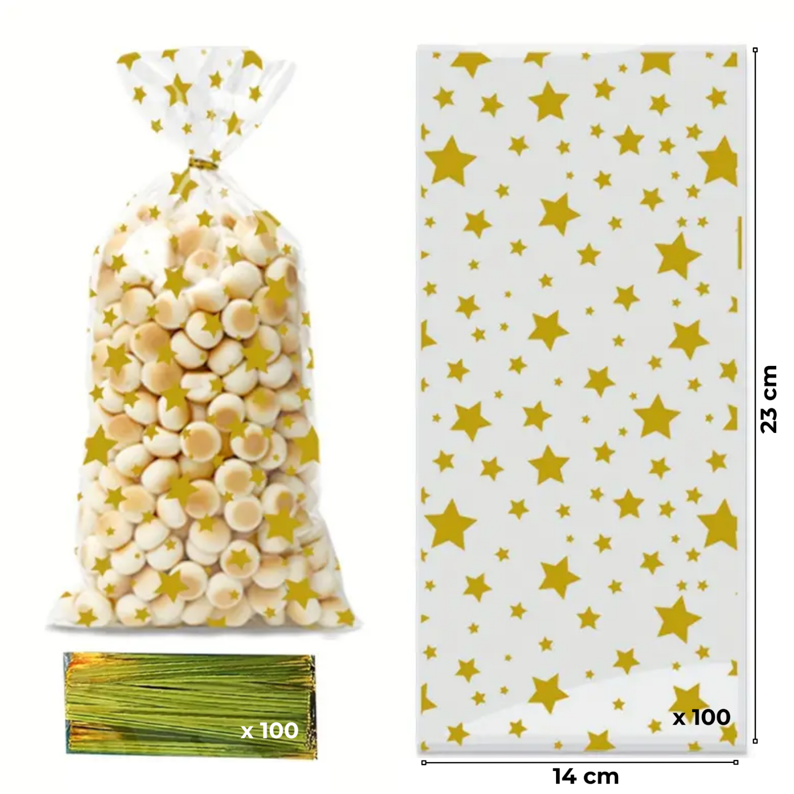 Zestaw 100 transparentnych woreczków celofanowych z nadrukiem złotych gwiazdek to idealne opakowanie na świąteczne paczki, prezenty mikołajkowe i drobne upominki. Woreczki mają wymiary 14x23x6 cm, co sprawia, że są wystarczająco przestronne na różnorodne drobiazgi. Dzięki dołączonym elementom do zamykania, możesz łatwo i estetycznie zabezpieczyć zawartość, tworząc elegancką prezentację.