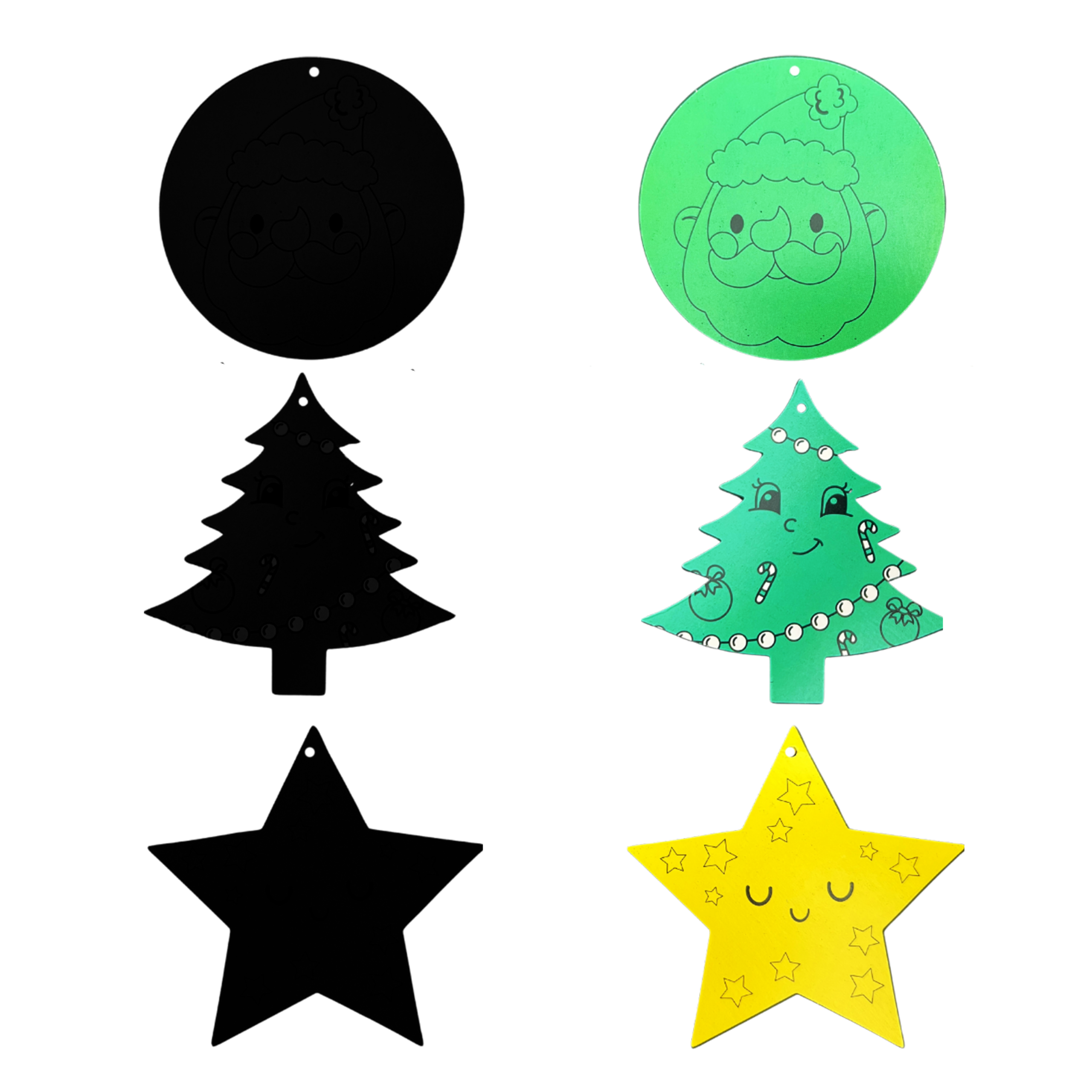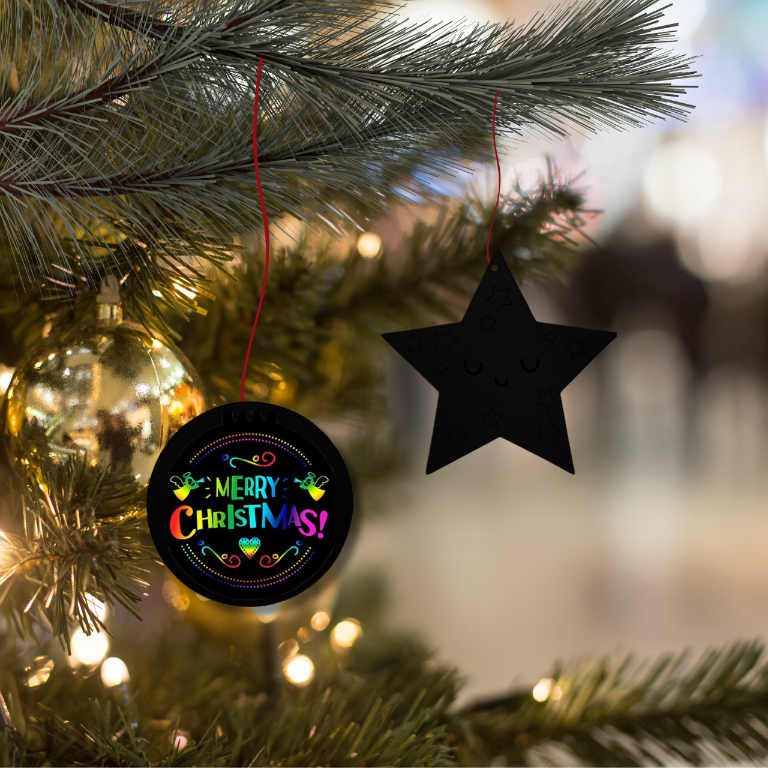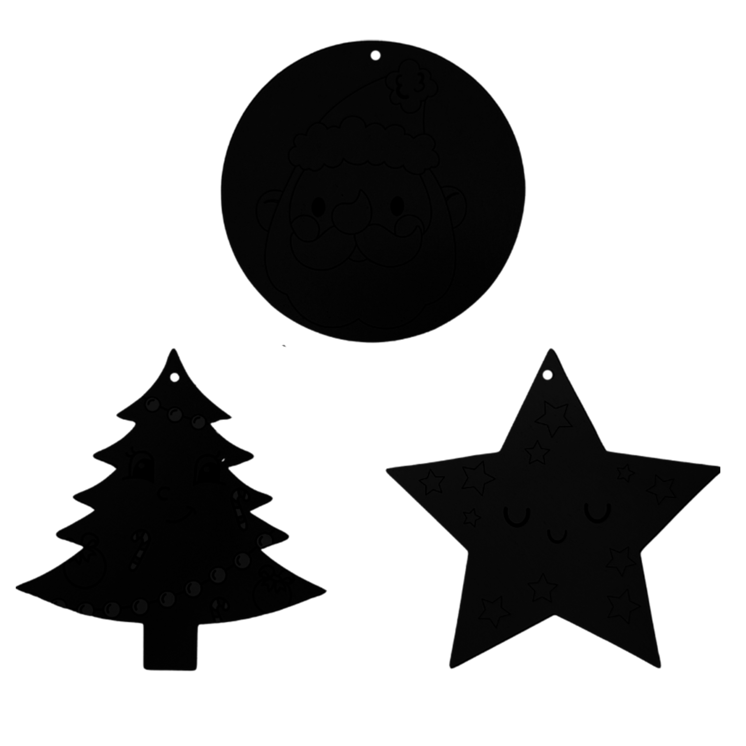 ✔️ 9 dwustronnych zawieszek – trzy kształty: choinka, bombka i gwiazdka, z nadrukiem po jednej stronie i warstwą kredową po drugiej.