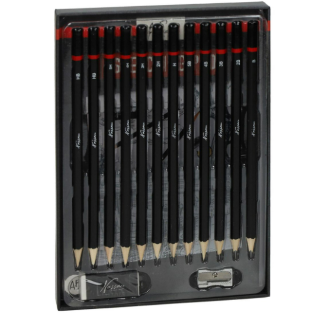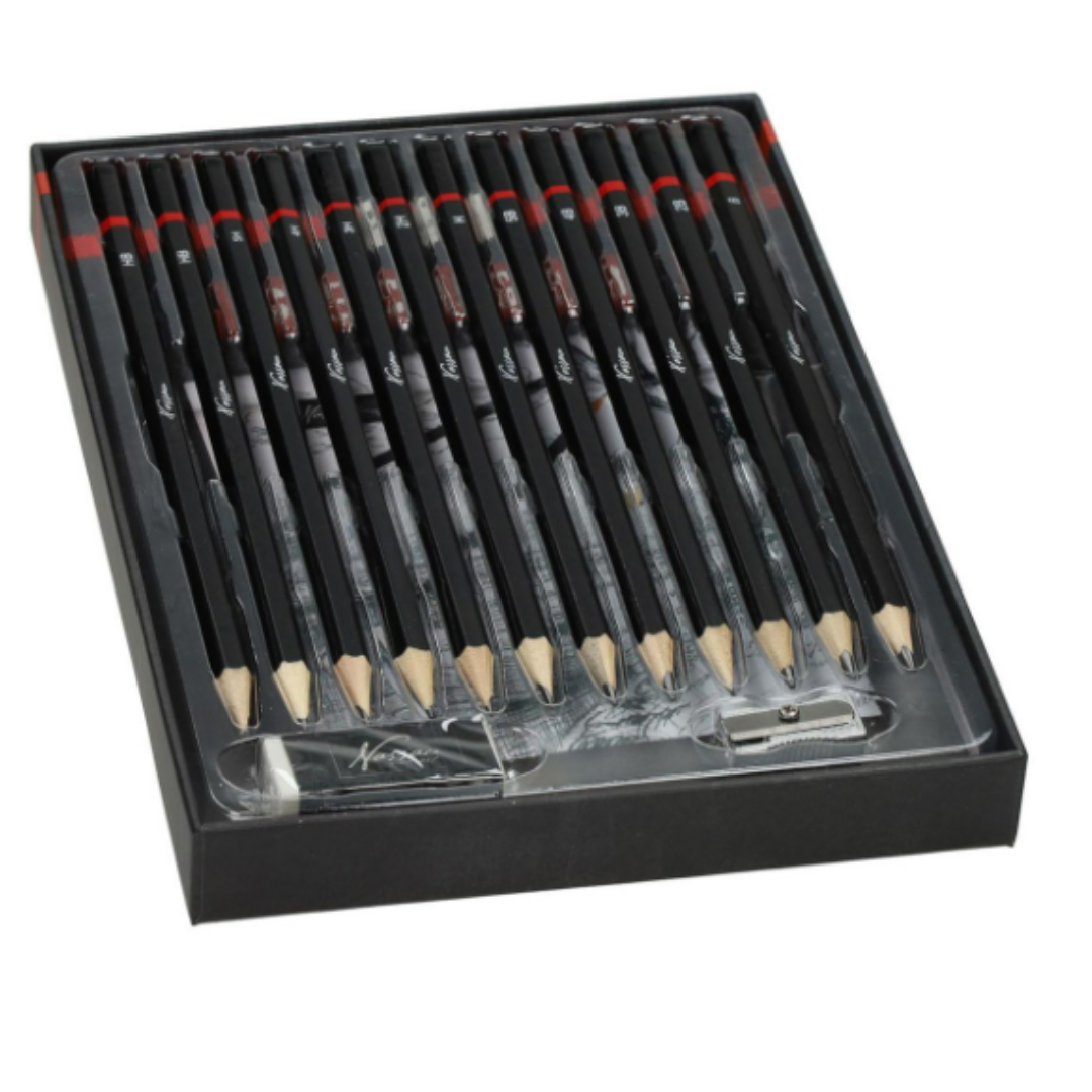 ✅ 12 ołówków szkicowych o twardościach B, 2B, 3B, 4B, 5B, H, 2H, 3H, 4H, 5H, 2x HB – pozwalają na uzyskanie zarówno delikatnych linii, jak i gęstego cieniowania