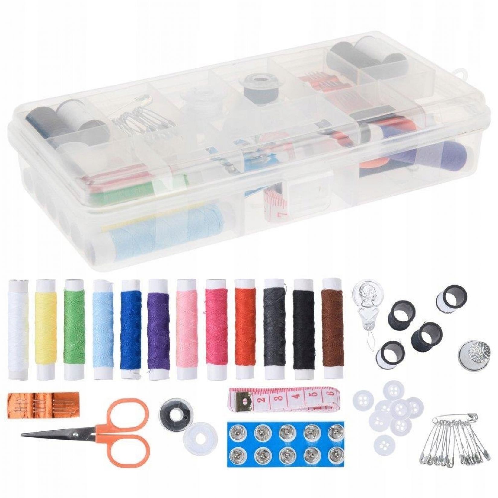 - Praktyczne narzędzia: Do zestawu dołączone są igły, nożyczki z pomarańczowymi uchwytami, miarka krawiecka, nawlekacz do igieł, naparstek oraz przezroczyste guziki i metalowe zapinki.